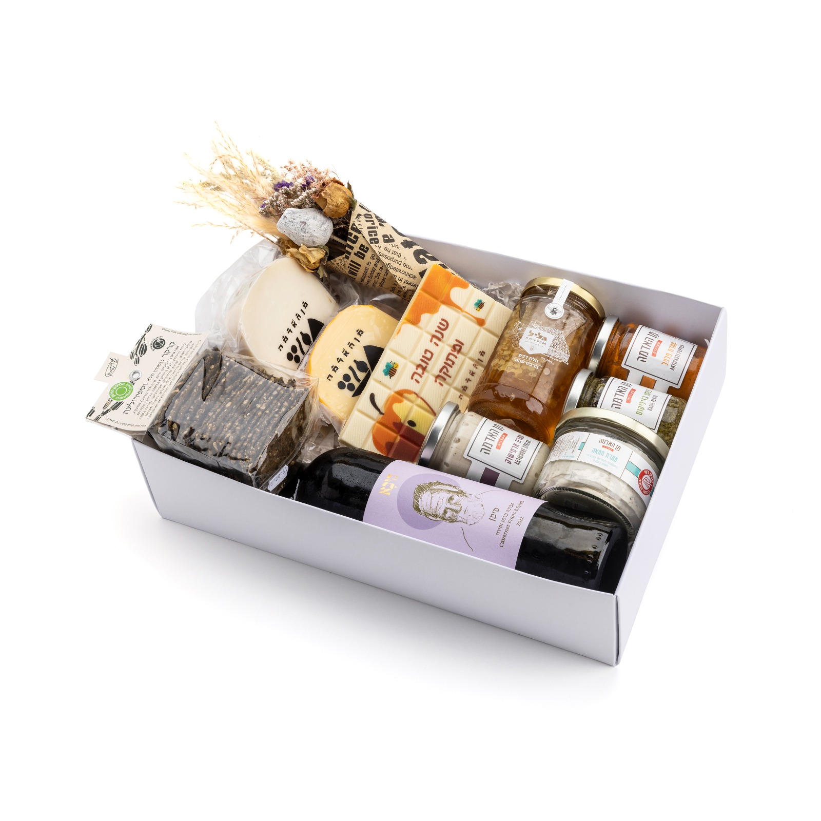 יין אדום מיקב היבא, קרקר כוסמין מלא, חמאת כמהין, דבש ישראלי 250ג', שלישיית ממרחי הבית (לימון,פסטו,ארטישוק),